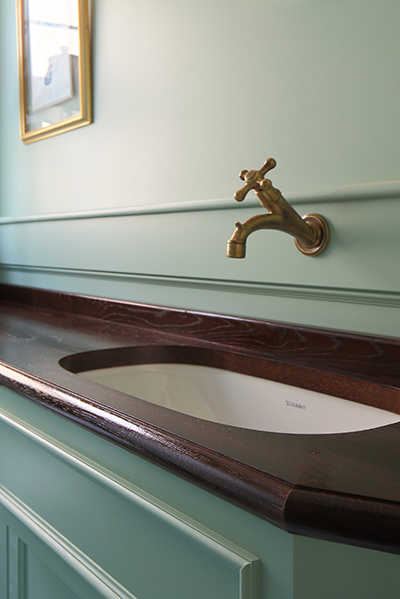 奥行きが少なかったので、壁付けの水栓金具を使用。